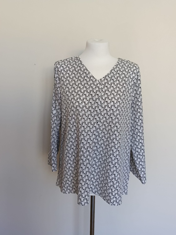 Stylowa bluzka damska w biało-czarny wzór, która świetnie sprawdzi się zarówno na co dzień, jak i do pracy czy eleganckich stylizacji. Model o luźniejszym kroju zapewnia wygodę i swobodę noszenia.