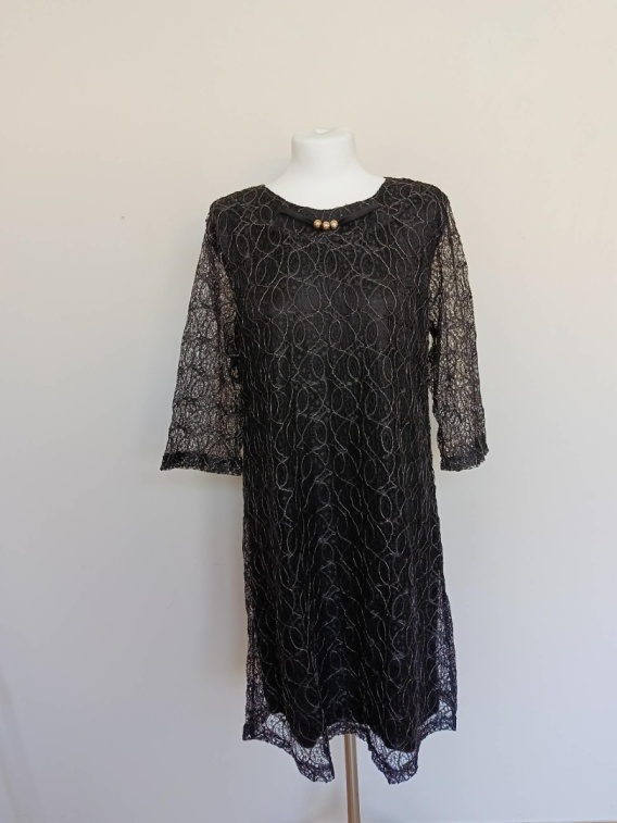 Elegancka czarna sukienka damska marki Miss Classic wykonana z efektownej koronki z delikatnym połyskującym wzorem. Klasyczny fason sprawia, że sukienka pięknie układa się na sylwetce i jest idealna na różne okazje.