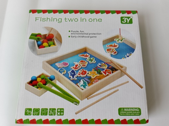 Dwustronna, drewniana gra edukacyjna „Fishing Two in One” to świetna zabawa dla dzieci od 3 lat! Zestaw łączy w sobie dwie aktywności: łowienie rybek na magnes oraz sortowanie kolorowych kulek przy pomocy drewnianych patyczków.