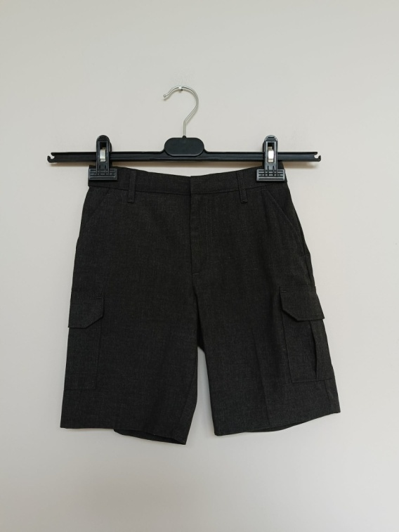 Grafitowe spodenki chłopięce marki TU w modnym fasonie cargo z kieszeniami po bokach. Idealne na co dzień, do szkoły lub na cieplejsze dni.