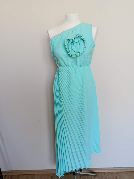 Elegancka sukienka damska w modnym miętowym kolorze o efektownym, asymetrycznym kroju. Model na jedno ramię z piękną plisowaną spódnicą oraz ozdobnym kwiatem 3D na biuście, który nadaje całości wyjątkowego charakteru.