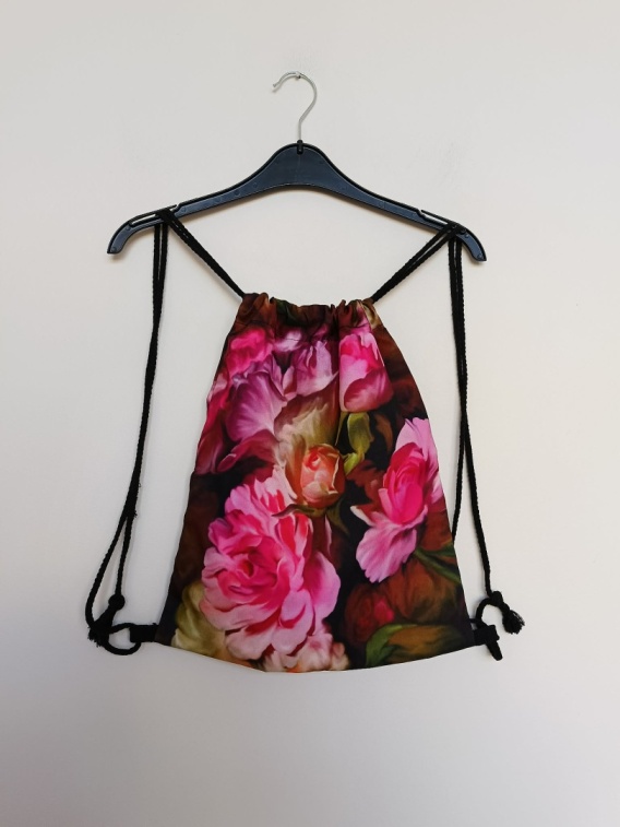 Stylowy plecak typu worek z efektownym kwiatowym wzorem w odcieniach różu i czerwieni. Lekki i wygodny – idealny na co dzień, do szkoły, na spacer, zakupy lub wycieczkę.