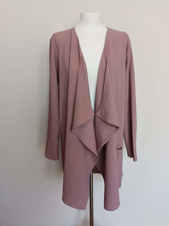 Stylowy kardigan damski w modnym pudrowo-różowym kolorze. Model o luźnym, wygodnym kroju z efektownym kaskadowym przodem oraz praktyczną kieszenią. Świetnie sprawdzi się jako lekka narzutka do codziennych stylizacji.