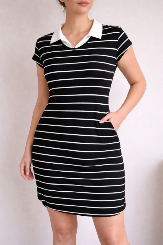 Stylowa, wygodna sukienka marki SHEIN w klasyczne czarno-białe paski. Model z ozdobnym, białym kołnierzykiem dodaje całości eleganckiego, szkolnego charakteru. Elastyczny materiał świetnie dopasowuje się do sylwetki, a prosty krój zapewnia komfort noszenia na co dzień.
