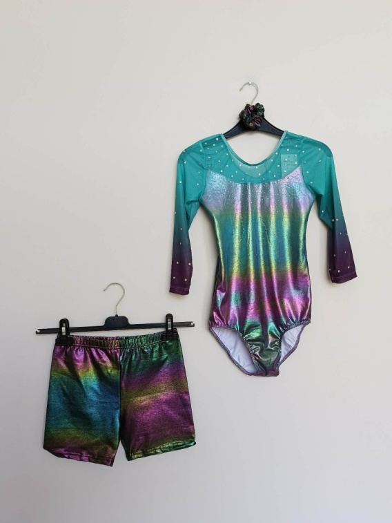 Efektowny, 2-częściowy strój dziewczęcy przeznaczony do gimnastyki, baletu, tańca oraz występów scenicznych. Zestaw składa się z długorękawowego body oraz dopasowanych spodenek w holograficznym, mieniącym się kolorze.