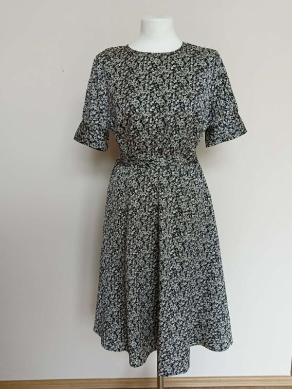 Stylowa sukienka marki H&M w drobny kwiatowy wzór. Czarne tło z jasnym printem sprawia, że model jest uniwersalny i ponadczasowy. Sukienka z krótkim rękawem, okrągłym dekoltem oraz podkreśloną talią. Lekko rozkloszowany dół pięknie układa się podczas noszenia.