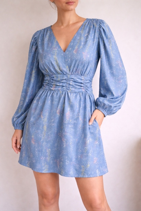 Używana sukienka marki Wellin w rozmiarze M. Model w pięknym niebieskim kolorze z delikatnym, abstrakcyjnym wzorem. Posiada efektowne drapowania w talii oraz bufiaste rękawy zakończone gumką. Sukienka ma głęboki dekolt w serek oraz zapięcie na suwak z tyłu. Ładnie podkreśla sylwetkę i świetnie sprawdzi się na różne okazje.