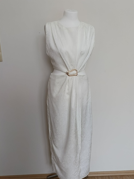 Sukienka damska ecru z wycięciami po bokach – elegancka midi klamra M
