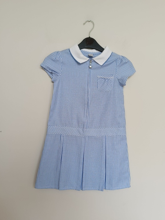 Klasyczna szkolna sukienka w niebieską kratkę marki Tu School. Idealna do szkoły i przedszkola – lekka, przewiewna i bardzo wygodna. Zapinana z przodu na suwak z ozdobną zawieszką, z białym kołnierzykiem oraz kieszonką.