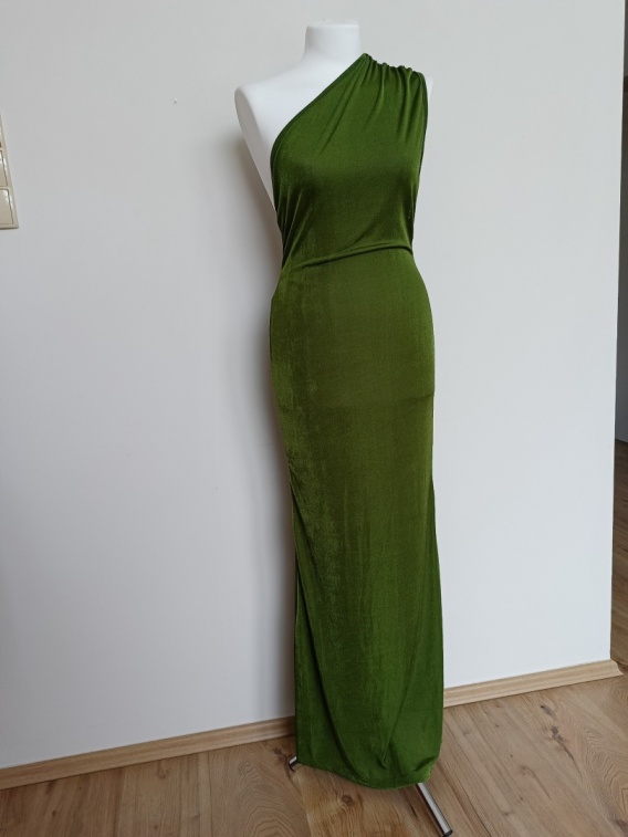 • Zielona połyskująca sukienka maxi SHEIN z wiązanym dekoltem i ozdobnym trenem | S
